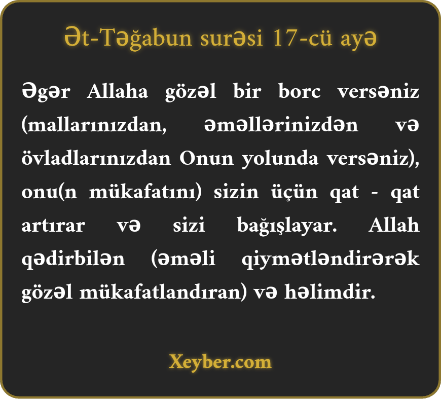 Əgər Allaha gözəl bir borc versəniz (mallarınızdan, əməllərinizdən və övladlarınızdan Onun yolunda versəniz), onu(n mükafatını) sizin üçün qat - qat artırar və sizi bağışlayar. Allah qədirbilən (əməli qiymətləndirərək gözəl mükafatlandıran) və həlimdir.