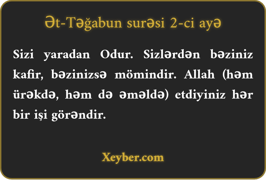 Sizi yaradan Odur. Sizlərdən bəziniz kafir, bəzinizsə mömindir. Allah (həm ürəkdə, həm də əməldə) etdiyiniz hər bir işi görəndir.