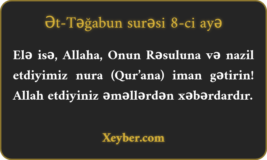 Elə isə, Allaha, Onun Rəsuluna və nazil etdiyimiz nura (Qur’ana) iman gətirin! Allah etdiyiniz əməllərdən xəbərdardır.