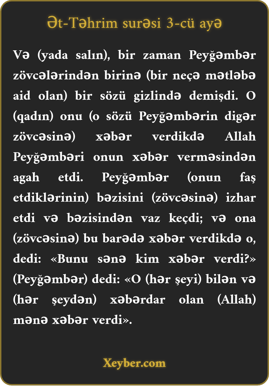 Və (yada salın), bir zaman Peyğəmbər zövcələrindən birinə (bir neçə mətləbə aid olan) bir sözü gizlində demişdi. O (qadın) onu (o sözü Peyğəmbərin digər zövcəsinə) xəbər verdikdə Allah Peyğəmbəri onun xəbər verməsindən agah etdi. Peyğəmbər (onun faş etdiklərinin) bəzisini (zövcəsinə) izhar etdi və bəzisindən vaz keçdi; və ona (zövcəsinə) bu barədə xəbər verdikdə o, dedi: «Bunu sənə kim xəbər verdi?» (Peyğəmbər) dedi: «O (hər şeyi) bilən və (hər şeydən) xəbərdar olan (Allah) mənə xəbər verdi».