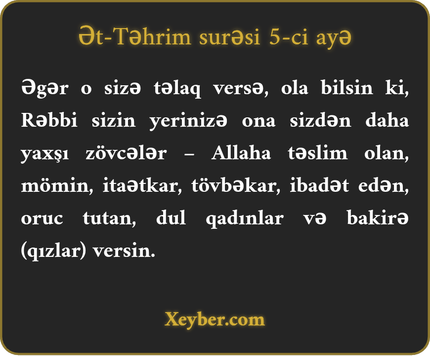 Əgər o sizə təlaq versə, ola bilsin ki, Rəbbi sizin yerinizə ona sizdən daha yaxşı zövcələr – Allaha təslim olan, mömin, itaətkar, tövbəkar, ibadət edən, oruc tutan, dul qadınlar və bakirə (qızlar) versin.