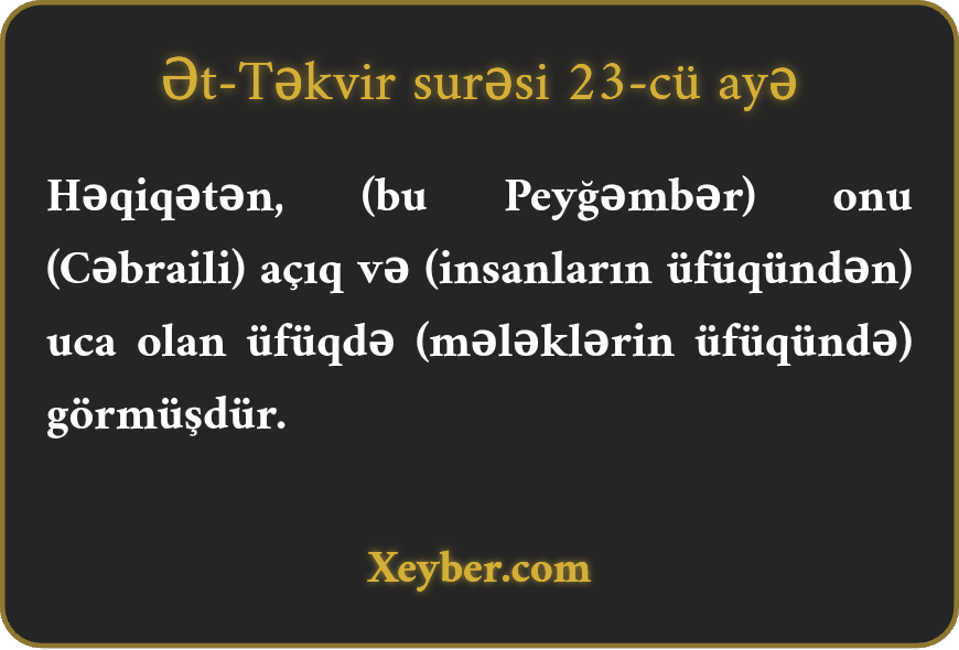 Həqiqətən, (bu Peyğəmbər) onu (Cəbraili) açıq və (insanların üfüqündən) uca olan üfüqdə (mələklərin üfüqündə) görmüşdür.