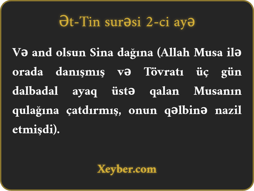 Və and olsun Sina dağına (Allah Musa ilə orada danışmış və Tövratı üç gün dalbadal ayaq üstə qalan Musanın qulağına çatdırmış, onun qəlbinə nazil etmişdi).