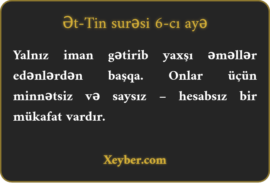 Yalnız iman gətirib yaxşı əməllər edənlərdən başqa. Onlar üçün minnətsiz və saysız – hesabsız bir mükafat vardır.