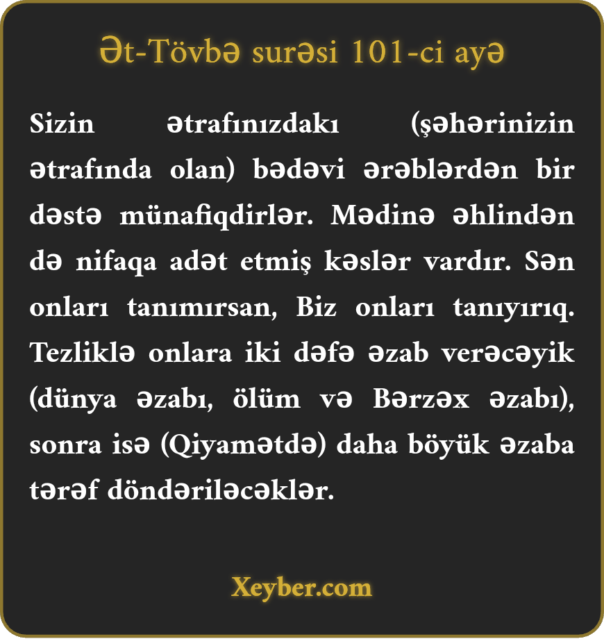 "Sizin bədəvi ardıcıllarınızdan bir qismi münafiqdir. Mədinə əhlinin də bir dəstəsi nifaqa üz tutmuşdur. Sən onları tanımırsan, onları Biz tanıyırıq. Tezliklə onlara iki əzab verəcəyik. Sonra ağır əzaba doğru qaytarılarlar.”