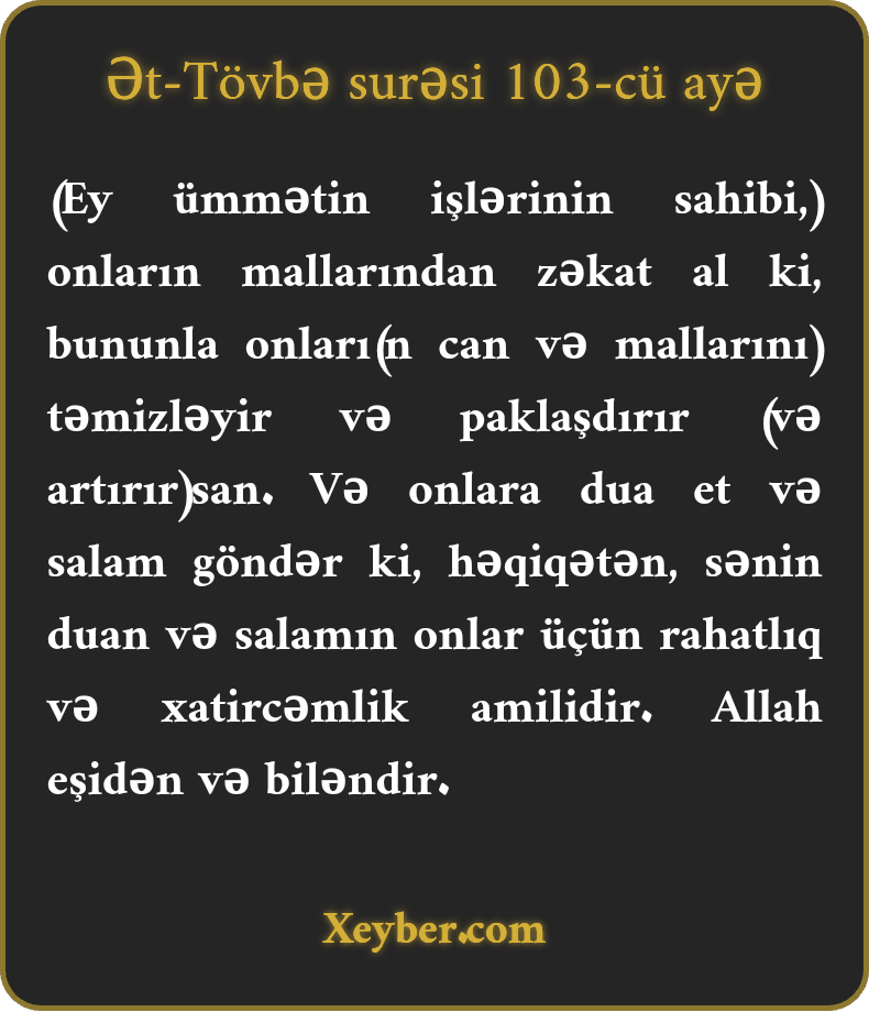 "Mallarından sədəqə al ki, bu yolla onları paklayasan, inkişaf etdirəsən. Onlara salam göndər (dua et). Çünki sənin duan onların aramlığına səbəb olur. Allah eşidən və biləndir.”