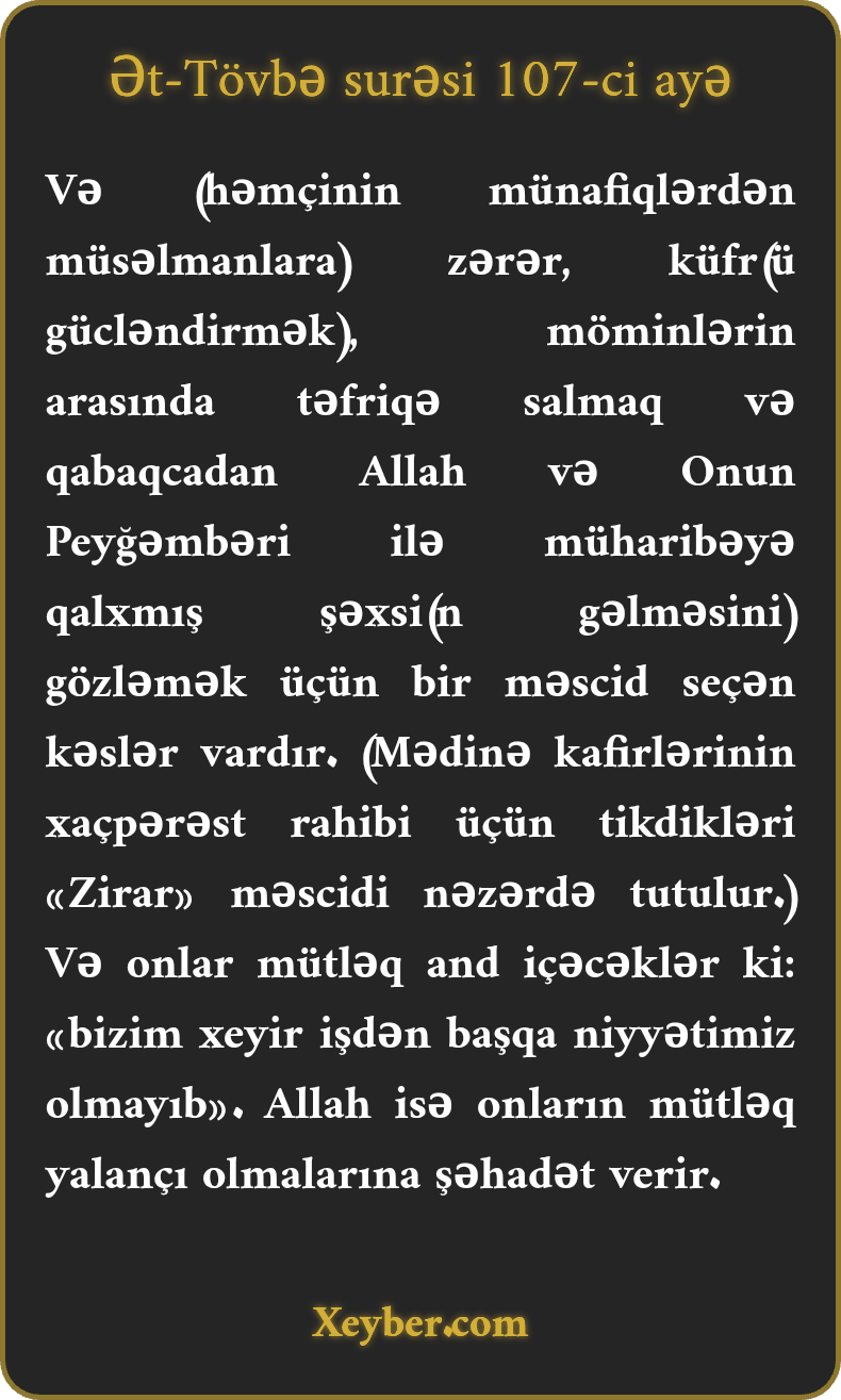 "(Münafiqlərdən bir dəstəsi də) o kəslərdir ki, İslama zərbə vurmaq, küfrü yaymaq və möminlər arasında təfriqə salmaq, Allah və Onun rəsulunun qədim düşmənlərinə pusqu üçün məscid tikdilər. Daim and içirlər ki, məqsədləri yalnız xeyirdir. (Amma) Allah şahiddir ki, onlar yalançıdırlar.”