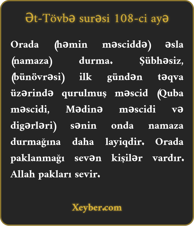 "Orada (Zirar məscidində) heç vaxt (namaza) durma. Həqiqətən, ilk gündən təqva üzərində bina olunmuş məscid namaz qılınması üçün daha layiqdir. (Çünki) o məsciddə paklanmaq istəyində olan kişilər var. Allah pakları sevir.”
