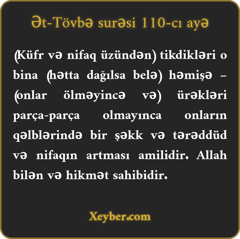 "Münafiqlərin qoyduğu bünövrə onların qəlblərində daimi bir tərəddüd səbəbidir. (Onların xilas yolları yoxdur.) Yalnız qəlbləri (nifaqdan) ayrılsa (nicat taparlar). Allah biləndir və hikmət sahibidir.”