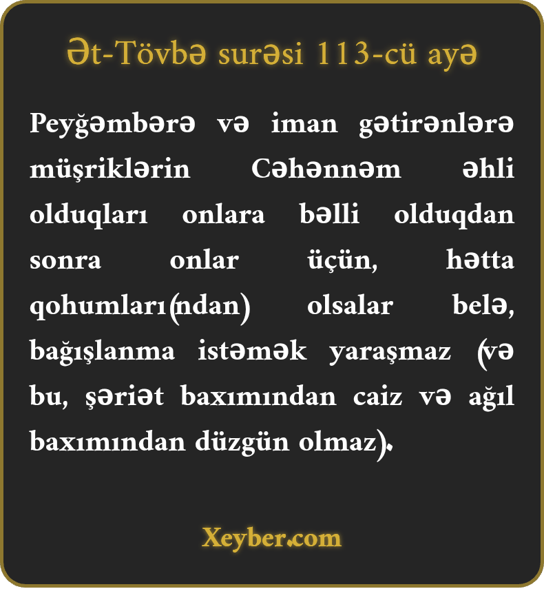 "Yaxşı deyil ki, peyğəmbər və ona iman gətirən kəslər müşriklərin cəhənnəm əhli olduğunu bildikdən sonra onların bağışlanmasını istəyələr–hətta qohumları da olsa!”