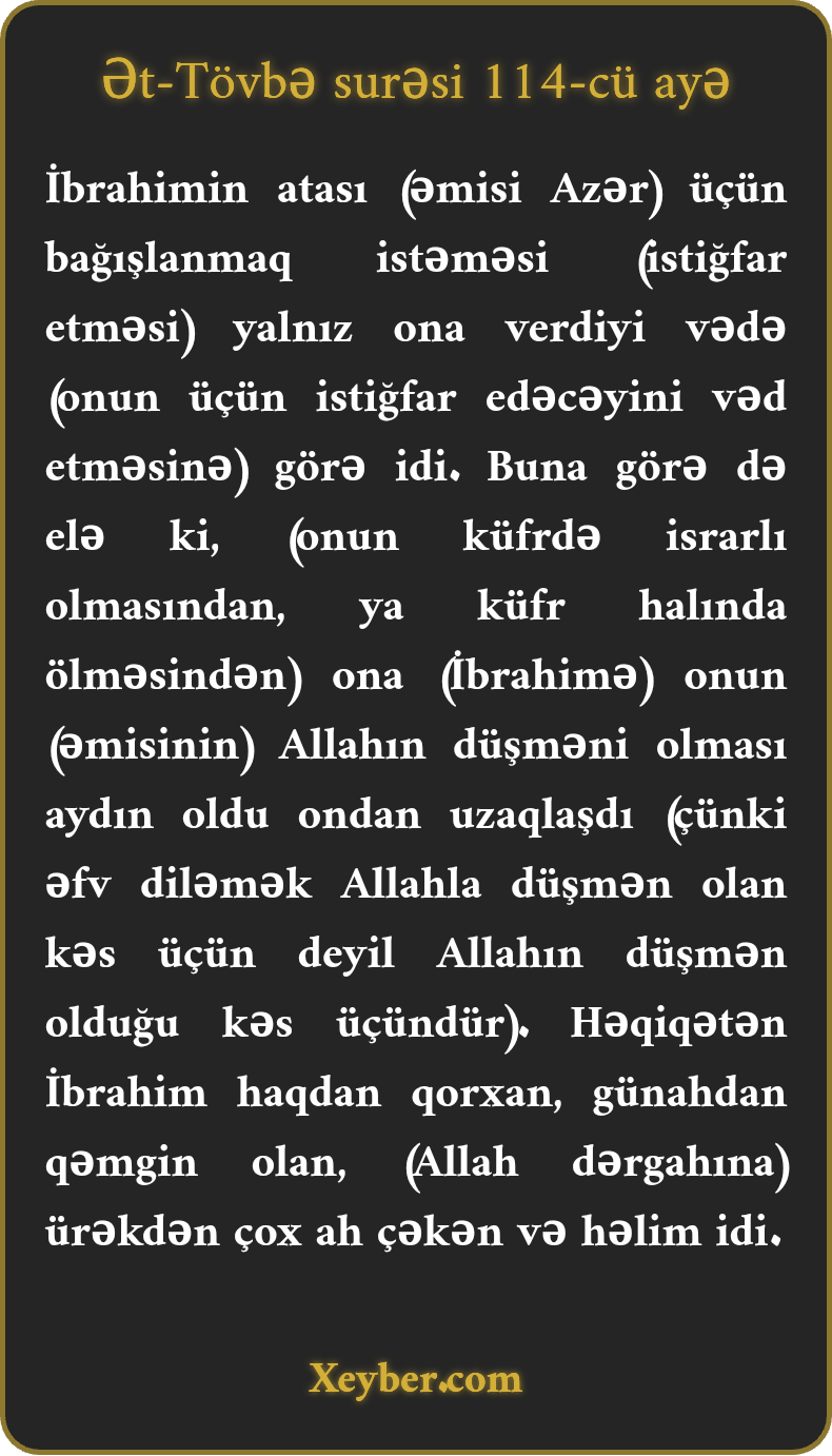 "İbrahimin öz atasının bağışlanmasını istəməsi yalnız ona verilmiş vədə görə idi. Allaha düşmən olduğunk bildikdən sonra ondan üz döndərdi. Həqiqətən, İbrahim (Allah qorxusundan) nalə çəkən və həlim idi.”