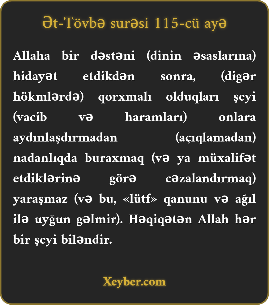 "Allah bir qövmü hidayət etdikdən sonra, çəkinməli olduqlarını bəyan etməmiş haqq yoldan çıxarmaz. Şübhəsiz, Allah hər şeyi biləndir.”