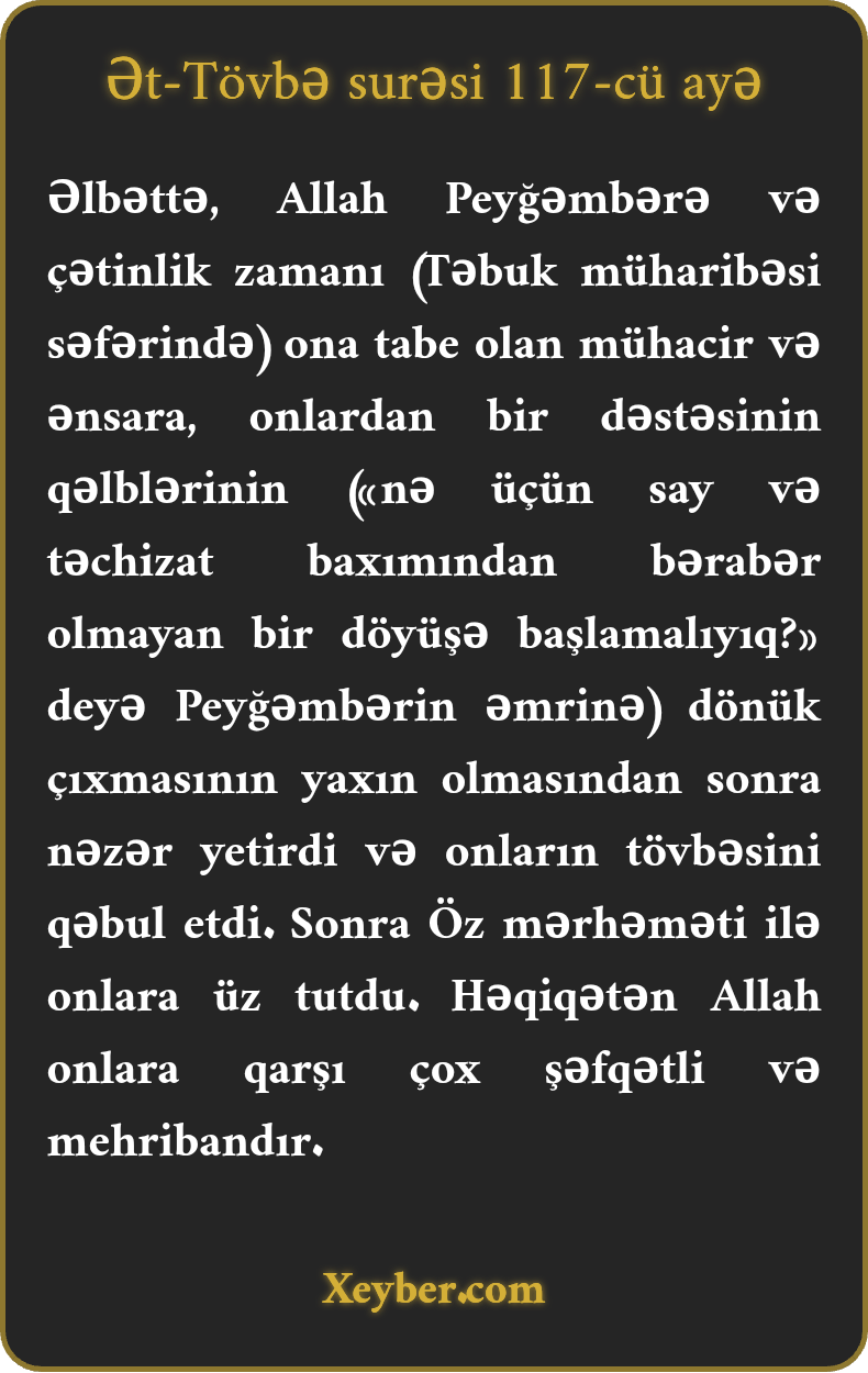 "Həqiqətən, Allah Peyğəmbərə, mühacirlərə və çətin anda ona itaət göstərən ənsara Öz lütfünü yağdırdı. Bundan öncə bəzilərinin qəlbi çaşmaq üzrəydi. Sonra Allah onlara Öz lütfünü qaytardı. Həqiqətən, (Allah) onlara rəfətli (mərhəmətli) və mehribandır.”