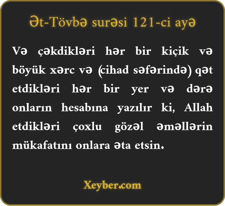 "Allah onlara etdiklərindən üstün mükafat versin deyə, infaq etdikləri az və ya çox bir mal, adladıqları bir vadi qeyd olunmamış qalmaz.”
