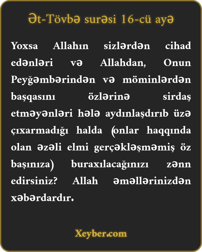 "Yoxsa güman edirdiniz ki, Allah sizlərdən cihad edib, Allahı, Onun rəsulunu və möminləri sirdaş seçənləri müəyyənləşdirməmiş azad buraxılarsınız?! Allah etdiyiniz işlərdən agahdır.”