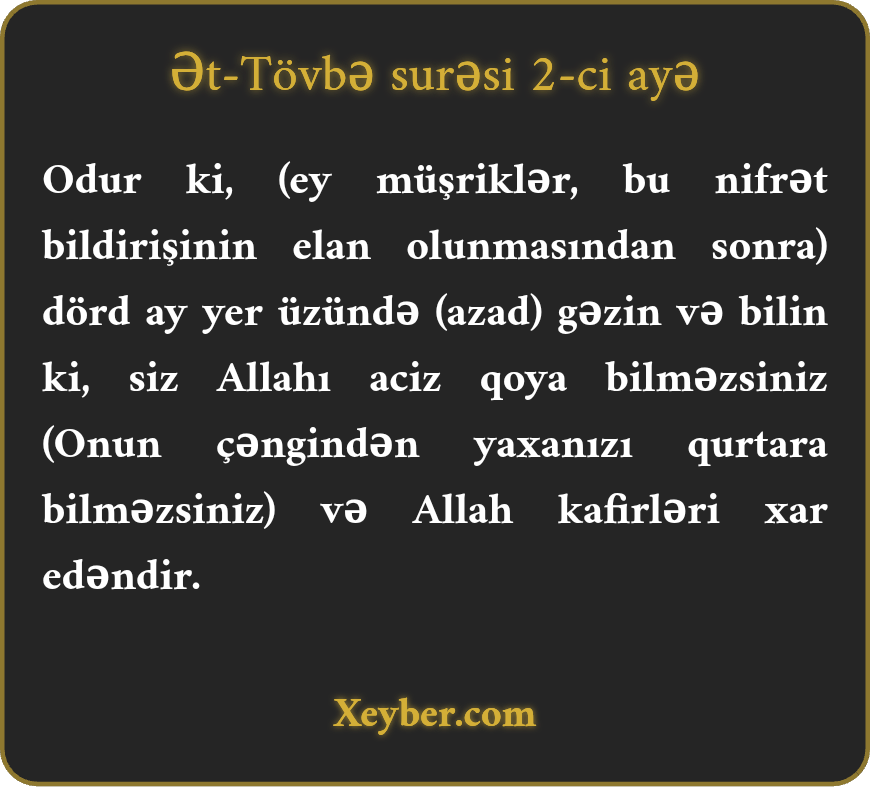 "(Ey müşriklər,) yer üzündə (azad) dolanmağınız üçün dörd ay möhlətiniz var və bilin ki, Allahı məğlub edə bilməzsiniz. Allah kafirləri zəlil edəndir.”