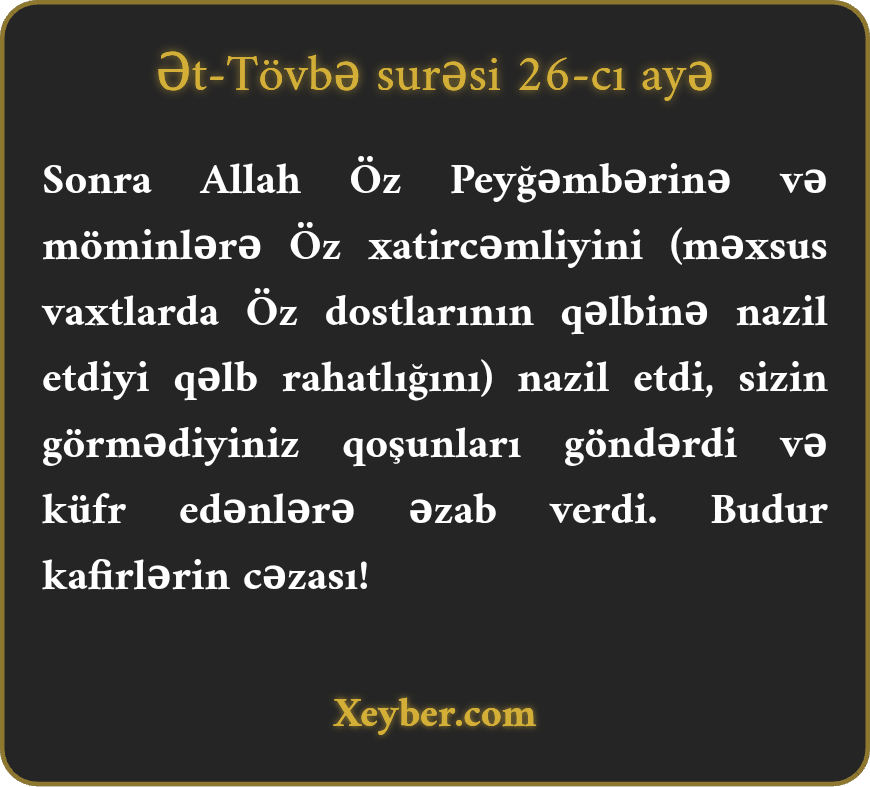 "Sonra Allah Öz peyğəmbərinə və möminlərə aramlıq nazil etdi. Görə bilmədiyiniz döyüşçülər göndərdi və kafirləri əzaba saldı. Bu, kafirlərin cəzasıdır.”