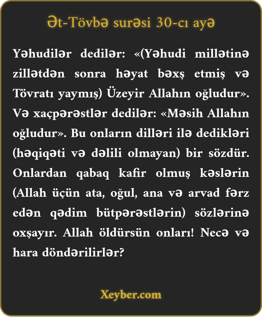 "Yəhudilər deyirdilər: "Üzeyir Allahın oğludur.” Məsihilər isə deyir: "Məsih (İsa) Allahın oğludur.” Onların ağızlarına aldıqları bu sözlər öncə kafir olanların sözlərinə oxşayır. (Onlar deyirdilər: "Mələklər Allahın qızlarıdır”) Onları Allah öldürsün! Necə də üz döndərirlər!”