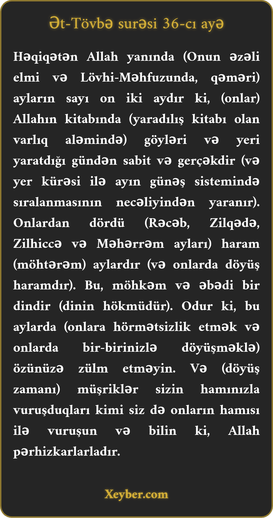 "Həqiqətən, Allah yanında, Allah kitabında ayların sayı göyləri və yeri yaratdığı gündən on iki aydır. Onlardan dördü (döyüş üçün) haramdır. Bu ayin sabit və möhkəmdir. Bu aylarda savaş, qan tökməklə özünüzə sitəm qılmayın. Müşriklər birlikdə sizinlə döyüşdüyü kimi siz də hamılıqla müşriklərlə döyüşün. Bilin ki, Allah Ondan çəkinənlərlədir.”