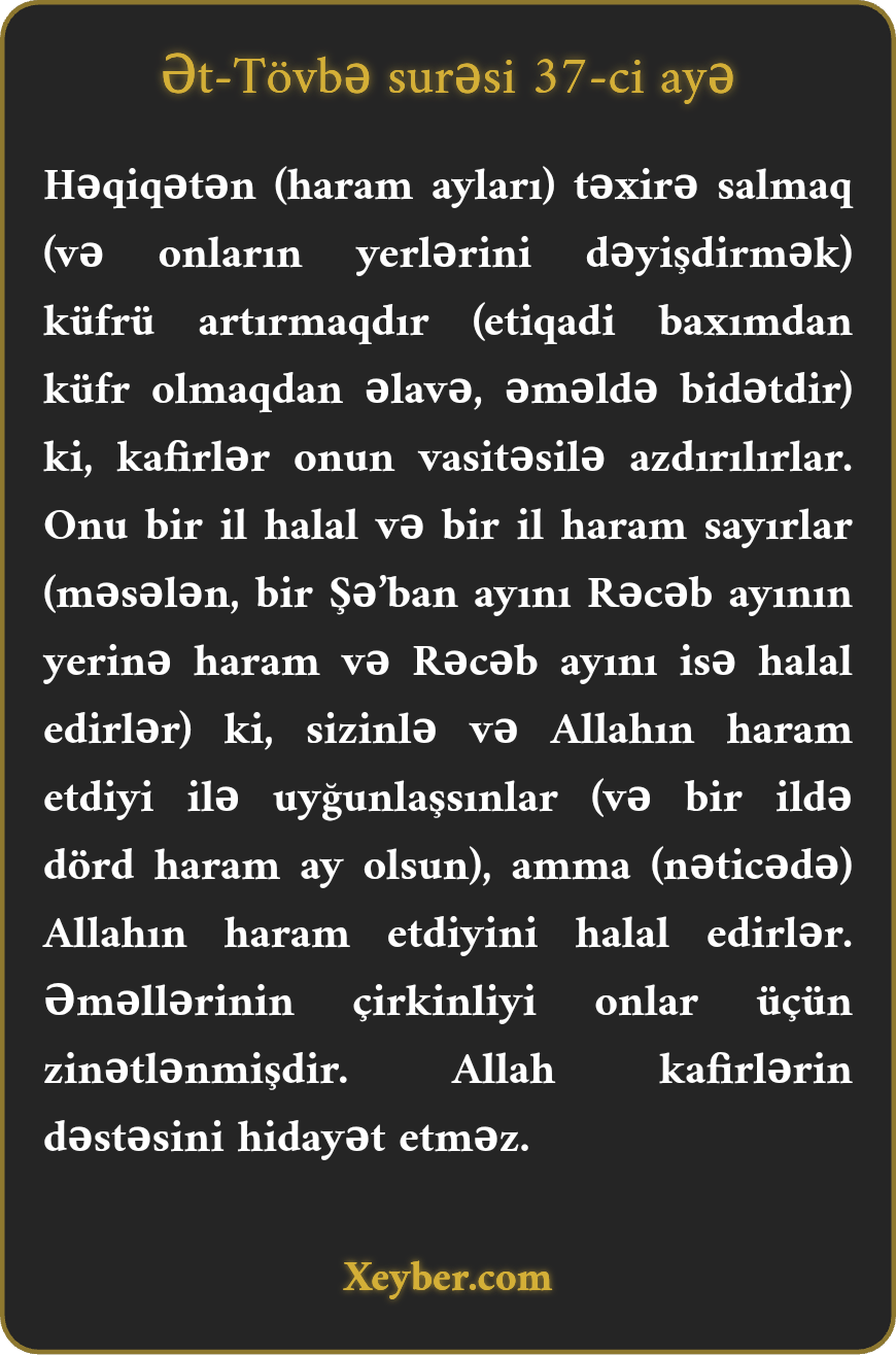 "Həqiqətən, təxir (haram ayların qeyri aylarla dəyişməsi) küfrün güclənməsinə səbəb olur. Bu yolla kafirlər azırlar. (Onlar) bir ili halal, digərini haram sayırlar ki, Allahın haram buyurduğu ayların sayı ilə uyğun gəlsin. Bu səbəbdən də Allahın haram buyurduğunu halal edirlər. Pis işləri onların nəzərlərində gözəl cilvələnmişdir. Allah kafirləri hidayət etməz.”