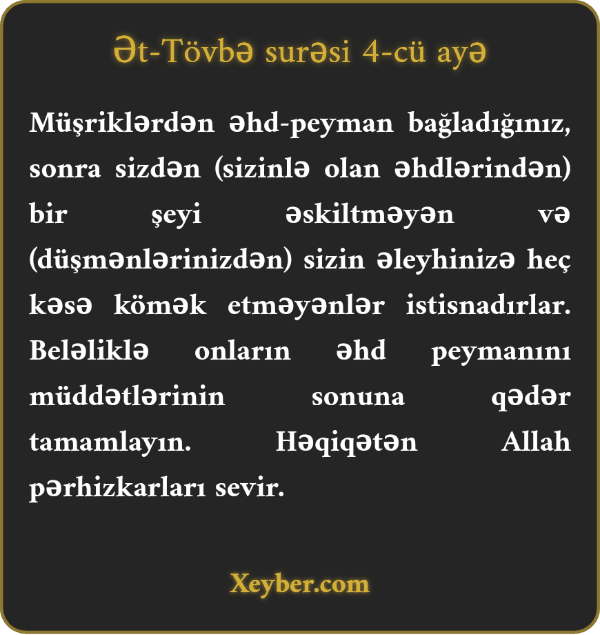 "Peyman bağladığınız, sizə münasibətdə öhdəçiliyini pozmayan və sizə qarşı çıxanlara yardım göstərməyən müşriklərlə peymanlarınızı müddəti başa çatanadək saxlayın. (Əhdinizə vəfalı olun.) Həqiqətən, Allah təqva əhlini sevir.”