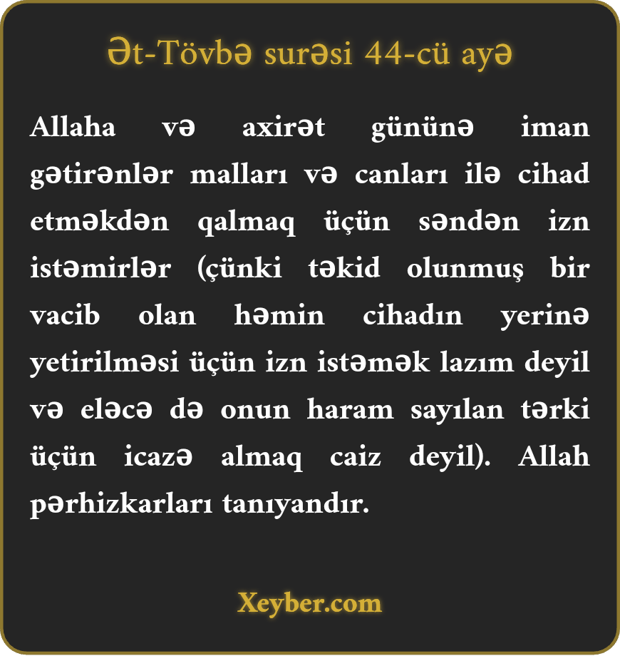 "Allaha və qiyamət gününə iman gətirənlər mal və canları ilə cihaddan məzuniyyətə çıxmaq üçün heç vaxt icazə istəməzlər. Allah təqvalılardan agahdır.”