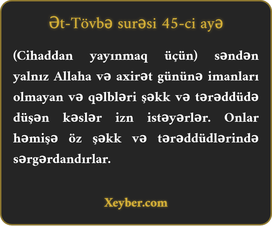 "Yalnız Allah və qiyamət gününə iman gətirməyənlər, qəlblərində tərəddüd olanlar səndən (cəbhəyə getməmək üçün) icazə alırlar. Onlar öz şəkk-şübhələrində vurnuxurlar.”
