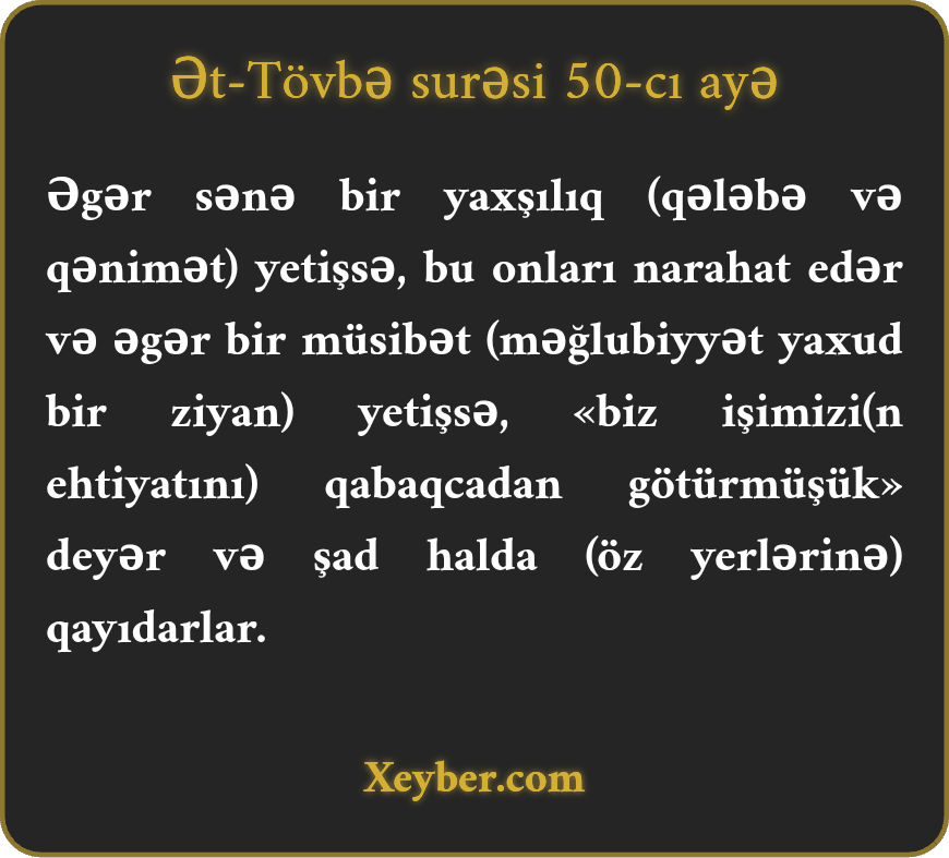 "Sənə yaxşılıq üz verdikdə münafiqlər narahat olurlar. Sənə bir müsibət üz verdikdə isə deyirlər: "Biz öncədən özümüzə çarə qılmışıq” və xoşhallıqla dönüb gedirlər.”