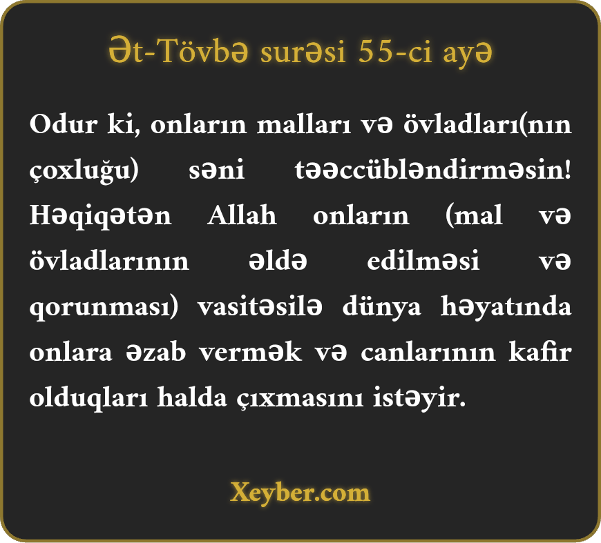 "Münafiqlərin var-dövləti və övladları səni təəccübləndirməsin. Allah bu vasitə ilə yalnız onu istəyir ki, onlara dünya həyatında əzab versin, canları küfr halında çıxsın.”
