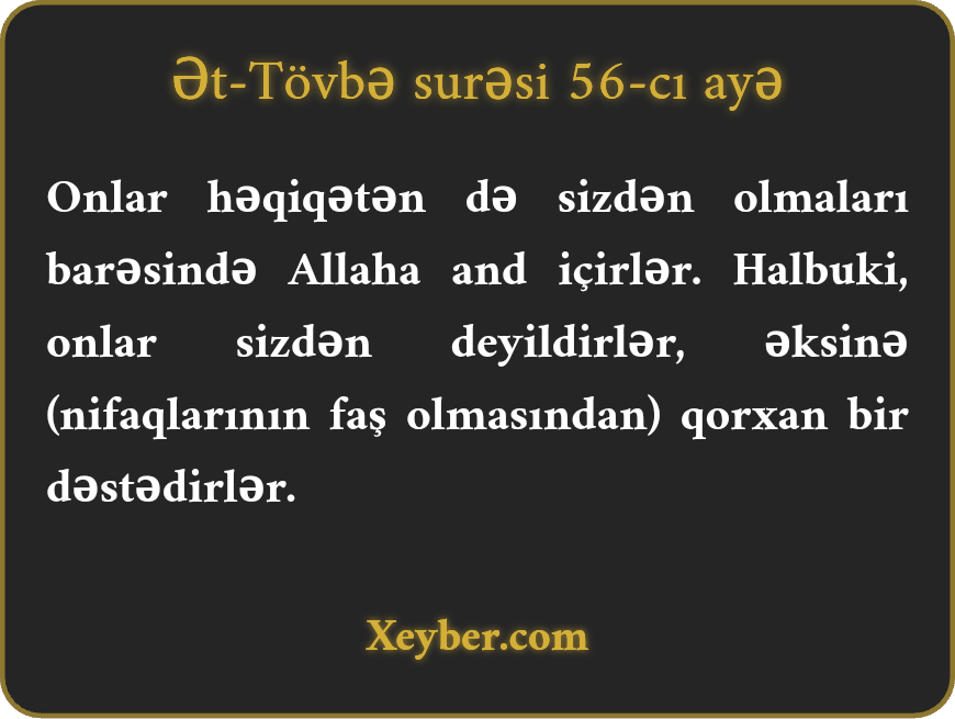 "Münafiqlər Allaha and içirlər ki, həqiqətən, onlar sizdəndirlər. Halbuki (yalan deyildirlər,) sizdən deyillər. Onlar (sizdən) qorxan bir qövmdürlər.”