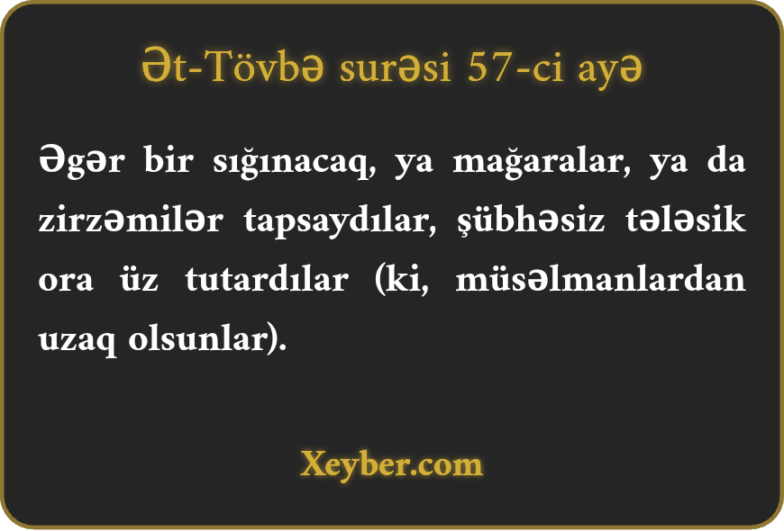 "Əgər (münafiqlər) sığınacaq, mağara və ya qaçmağa yol tapsaydılar, şübhəsiz ki, tələsik ora üz tutardılar.”
