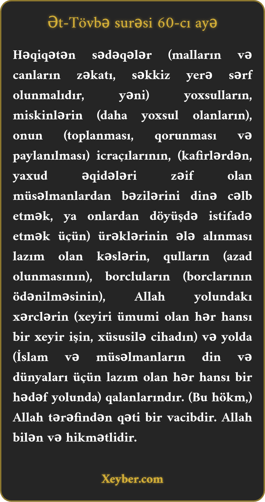 "Həqiqətən, sədəqələr (zəkat) ehtiyaclılar, miskinlər, zəkatı yerbəyer edənlər, qəlblərin cazibəsi, qulların azad edilməsi, borcluların borcunun ödənməsi, Allah yolunda (cihada) sərf və yolda qalanları təmin etmək üçündür. Bu, Allah tərəfindən göstərişdir. Allah biləndir və hikmət sahibidir.”