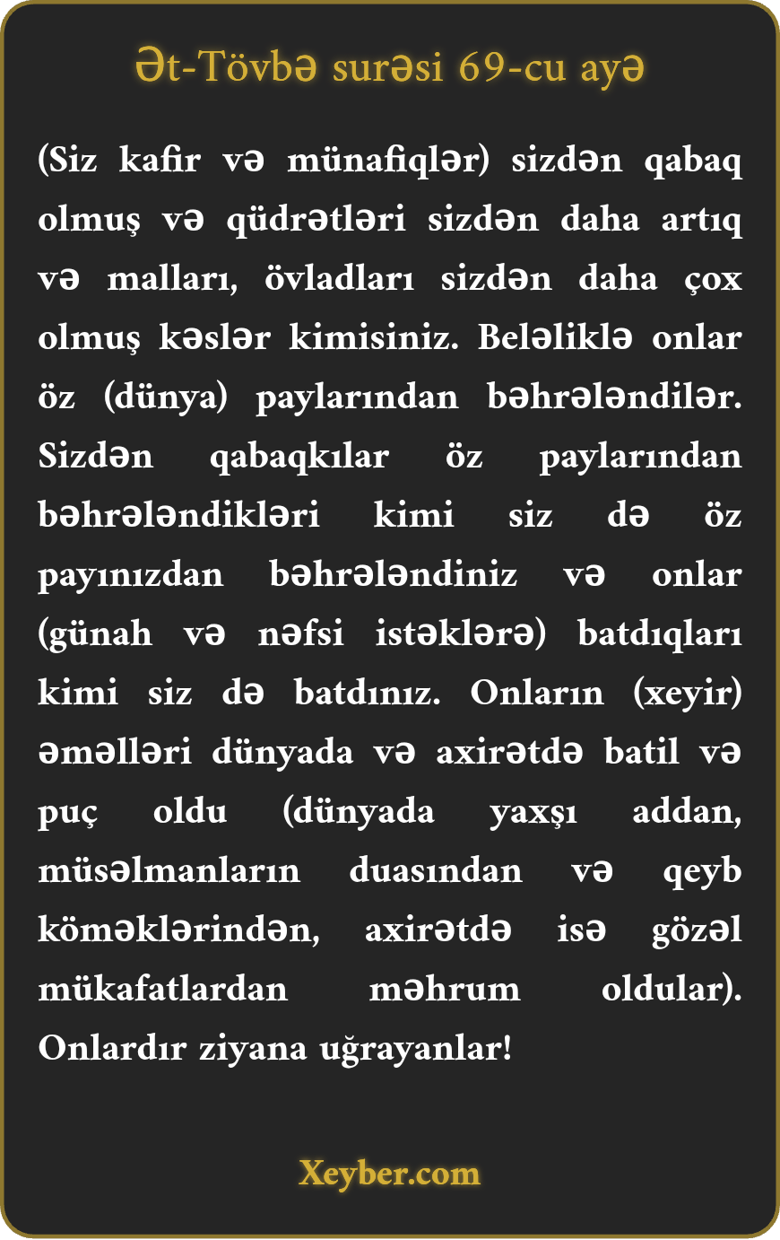 "(Siz münafiqlərin halı) sizdən əvvəlkilərinki kimidir. (Halbuki) onlar sizdən daha güclü, daha varlı idilər və daha çox övladları vardı. Onlar öz paylarını aldılar. Siz də özünüzdən əvvəlkilər kimi bəhrələndiniz. (Öz batil yolunuzda) itib-batdınız. Onların əməlləri dünya və axirətdə puça çıxdı, onlar həmin ziyankarlardırlar.”