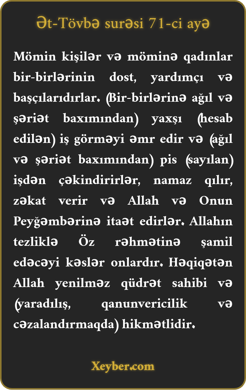 "İmanlı kişilər və qadınlar bir-birlərinin köməkçisi və himayədarıdırlar. (Onlar) yaxşılığı əmr edir, pisliyə qadağa qoyur, namazı iqamə edir, zəkat ödəyir, Allah və Onun rəsuluna itaət göstərirlər. Tezliklə Allah onları Öz rəhmətində qərar verəcəkdir. Həqiqətən, Allah qalibdir (qüvvəli) və hikmət sahibidir.”