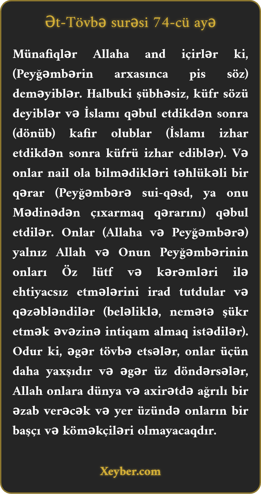 "(Münafiqlər) Allaha and içirlər ki, (küfr sözlər) danışmamışlar. Halbuki şübhəsiz, küfr demişlər. Onlar İslamı qəbul etdikdən sonra kafir oldular. Elə bir qərara gəldilər ki, ona əlləri çatmadı. (Peyğəmbəri qətlə yetirə bilmədilər.) Allah və rəsulunun onları öz lütfündən ehtiyacsız etməsindən savay (peyğəmbər və möminlər üçün) bir eyb tapmadılar. (Bununla belə,) əgər tövbə etsələr, onlar üçün daha yaxşıdır. Əgər üz döndərsələr, Allah onları dünya və axirətdə ağrılı əzaba düçar edər və yer üzündə onlar üçün heç bir dost və yardımçı tapılmaz.”