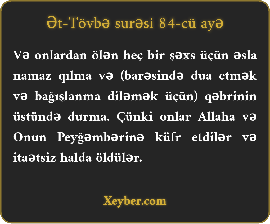 "Münafiqlərdən heç birisinin ölüsünə namaz qılma və dua üçün qəbri üstə dayanma. Çünki onlar Allaha və Onun rəsuluna kafir oldular, azğın halda dünyadan getdilər.”
