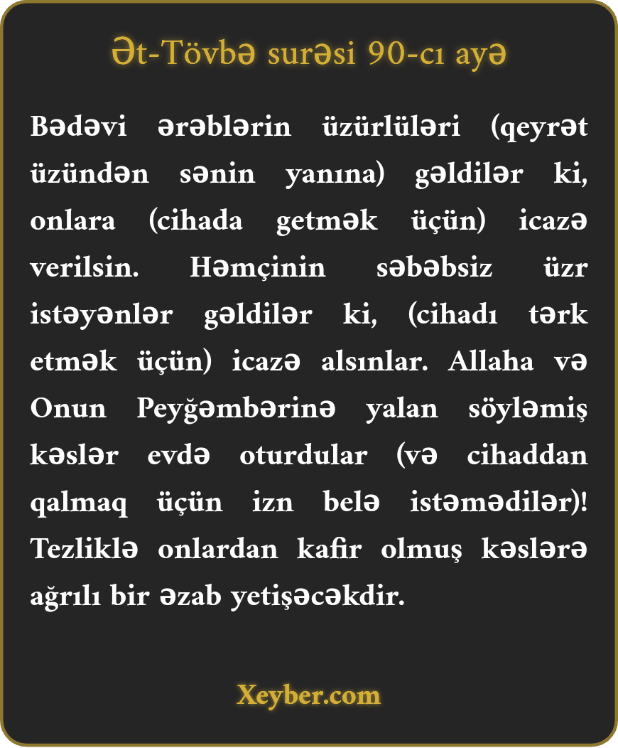 "Üzrü olan bədəvilər (sənin yanına) gəldilər ki, onlara (döyüşdə iştirak etməmək üçün) icazə verilsin. Amma Allaha və Onun peyğəmbərinə yalan deyənlər (üzrü olmayanlar) savaşdan boyun qaçırdılar. Onlardan küfr edənlərə tezliklə ağrılı əzab yetişəcək.”