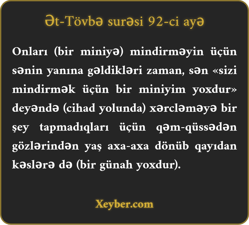"Miniyə süvar edib cəbhəyə göndərməyin üçün yanına gəldikdə "sizi süvar etmək üçün bir şey tapmıram” dediyin və bundan sonra dönüb gedənlər üçün də (irad yoxdur). Cihada xərcləmək üçün bir şeyləri olmadığından onların qəm-qüssədən gözləri yaşlı idi. (Bəli, cihad aşiqi olan belə yoxsullar üçün cəbhəyə getməmək günah deyil.)”