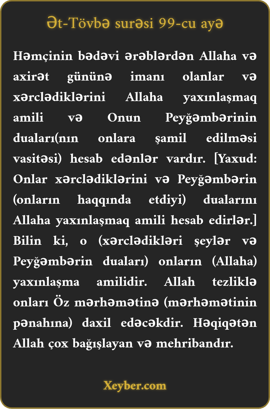 "Amma bədəvi ərəblərdən bəziləri Allaha və qiyamət gününə imanlı kəslərdir. Onlar infaq etdiklərini Allaha yaxınlıq və peyğəmbərin duası üçün vasitə bilirlər. Agah olun ki, həmin infaqlar onlar üçün yaxınlıq səbəbidir. Tezliklə Allah onları Öz rəhmətinə daxil edər. Həqiqətən, Allah bağışlayan və mehribandır.”