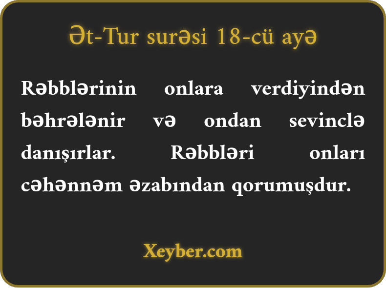Rəbblərinin onlara verdiyindən bəhrələnir və ondan sevinclə danışırlar. Rəbbləri onları cəhənnəm əzabından qorumuşdur.