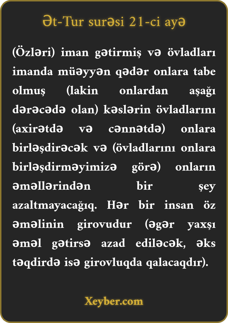 (Özləri) iman gətirmiş və övladları imanda müəyyən qədər onlara tabe olmuş (lakin onlardan aşağı dərəcədə olan) kəslərin övladlarını (axirətdə və cənnətdə) onlara birləşdirəcək və (övladlarını onlara birləşdirməyimizə görə) onların əməllərindən bir şey azaltmayacağıq. Hər bir insan öz əməlinin girovudur (əgər yaxşı əməl gətirsə azad ediləcək, əks təqdirdə isə girovluqda qalacaqdır).