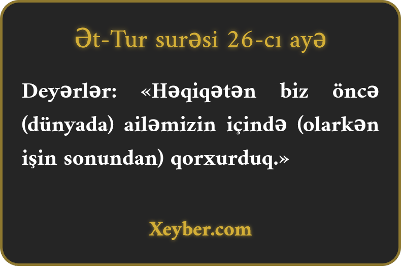 Deyərlər: «Həqiqətən biz öncə (dünyada) ailəmizin içində (olarkən işin sonundan) qorxurduq.»