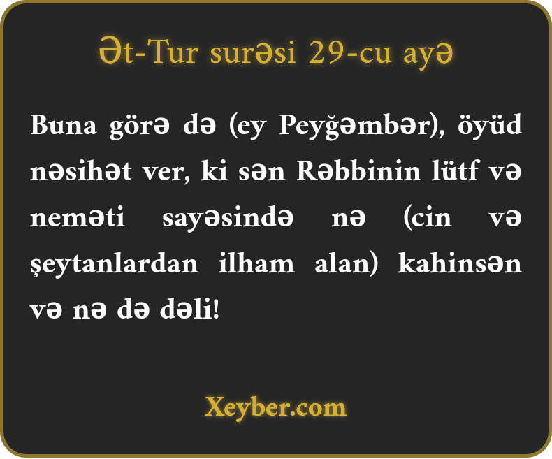 Buna görə də (ey Peyğəmbər), öyüd nəsihət ver, ki sən Rəbbinin lütf və neməti sayəsində nə (cin və şeytanlardan ilham alan) kahinsən və nə də dəli!