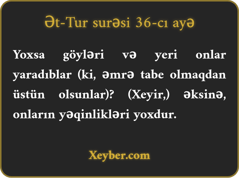 Yoxsa göyləri və yeri onlar yaradıblar (ki, əmrə tabe olmaqdan üstün olsunlar)? (Xeyir,) əksinə, onların yəqinlikləri yoxdur.