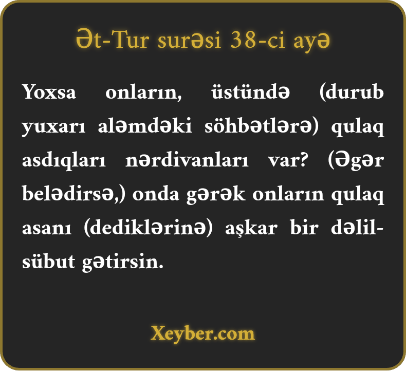 Yoxsa onların, üstündə (durub yuxarı aləmdəki söhbətlərə) qulaq asdıqları nərdivanları var? (Əgər belədirsə,) onda gərək onların qulaq asanı (dediklərinə) aşkar bir dəlil-sübut gətirsin.