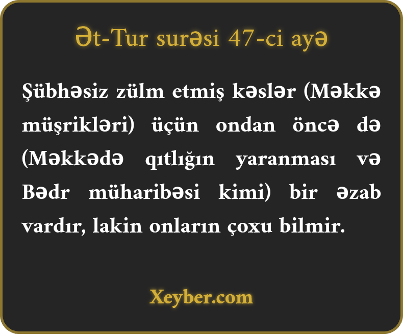 Şübhəsiz zülm etmiş kəslər (Məkkə müşrikləri) üçün ondan öncə də (Məkkədə qıtlığın yaranması və Bədr müharibəsi kimi) bir əzab vardır, lakin onların çoxu bilmir.