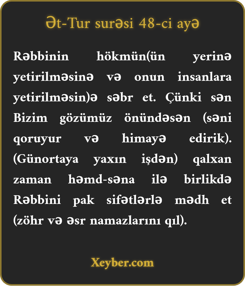 Rəbbinin hökmün(ün yerinə yetirilməsinə və onun insanlara yetirilməsin)ə səbr et. Çünki sən Bizim gözümüz önündəsən (səni qoruyur və himayə edirik). (Günortaya yaxın işdən) qalxan zaman həmd-səna ilə birlikdə Rəbbini pak sifətlərlə mədh et (zöhr və əsr namazlarını qıl).