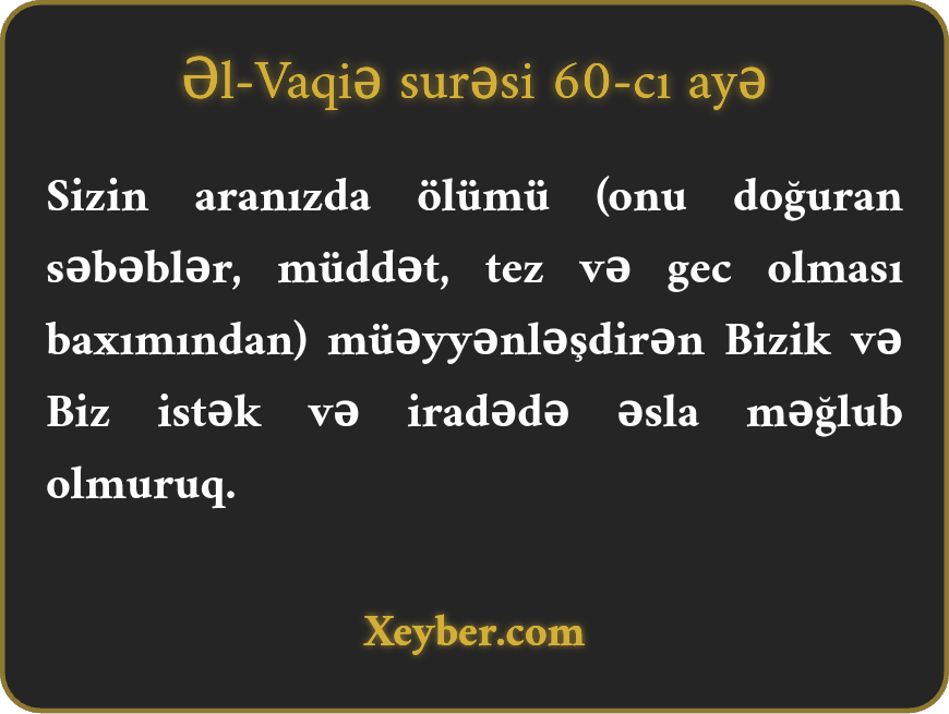 Sizin aranızda ölümü (onu doğuran səbəblər, müddət, tez və gec olması baxımından) müəyyənləşdirən Bizik və Biz istək və iradədə əsla məğlub olmuruq.