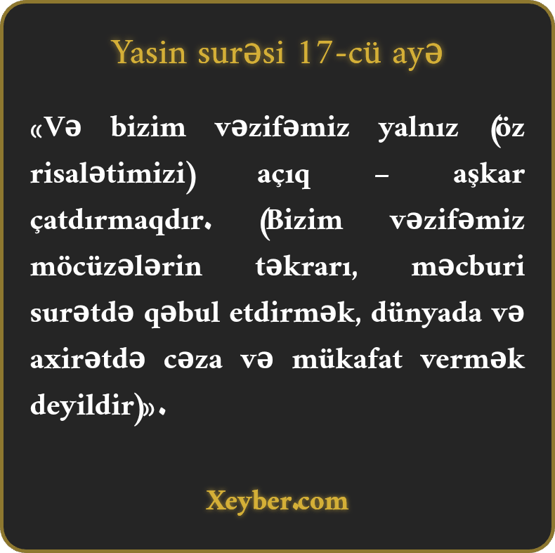 «Və bizim vəzifəmiz yalnız (öz risalətimizi) açıq – aşkar çatdırmaqdır. (Bizim vəzifəmiz möcüzələrin təkrarı, məcburi surətdə qəbul etdirmək, dünyada və axirətdə cəza və mükafat vermək deyildir)».