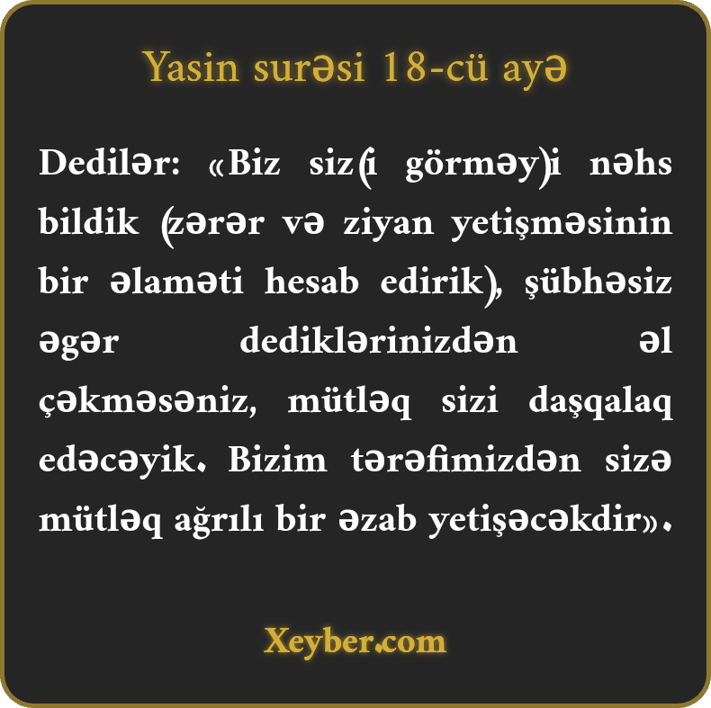 Dedilər: «Biz siz(i görməy)i nəhs bildik (zərər və ziyan yetişməsinin bir əlaməti hesab edirik), şübhəsiz əgər dediklərinizdən əl çəkməsəniz, mütləq sizi daşqalaq edəcəyik. Bizim tərəfimizdən sizə mütləq ağrılı bir əzab yetişəcəkdir».